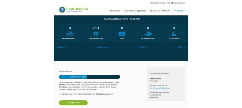Anmelden können sich Interessierte schon jetzt unter www.stadtradeln.de/radlerbereich. Wählen Sie hierbei bitte unter dem Punkt „Kommune wählen“ das Bundesland Hessen und die Kommune Fürth im Odenwald im Kreis Bergstraße aus.