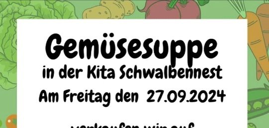 Am Freitag, den 27. September 2024, wird ab 12.00 Uhr im Hof der Kindertagesstätte Schwalbennest in Fahrenbach leckere Gemüsesuppe auf Spendenbasis verkauft.